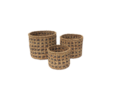 Kit 3 cestas vime cilindro, natural e preto 30x25cm,24x21cm,20x17cm