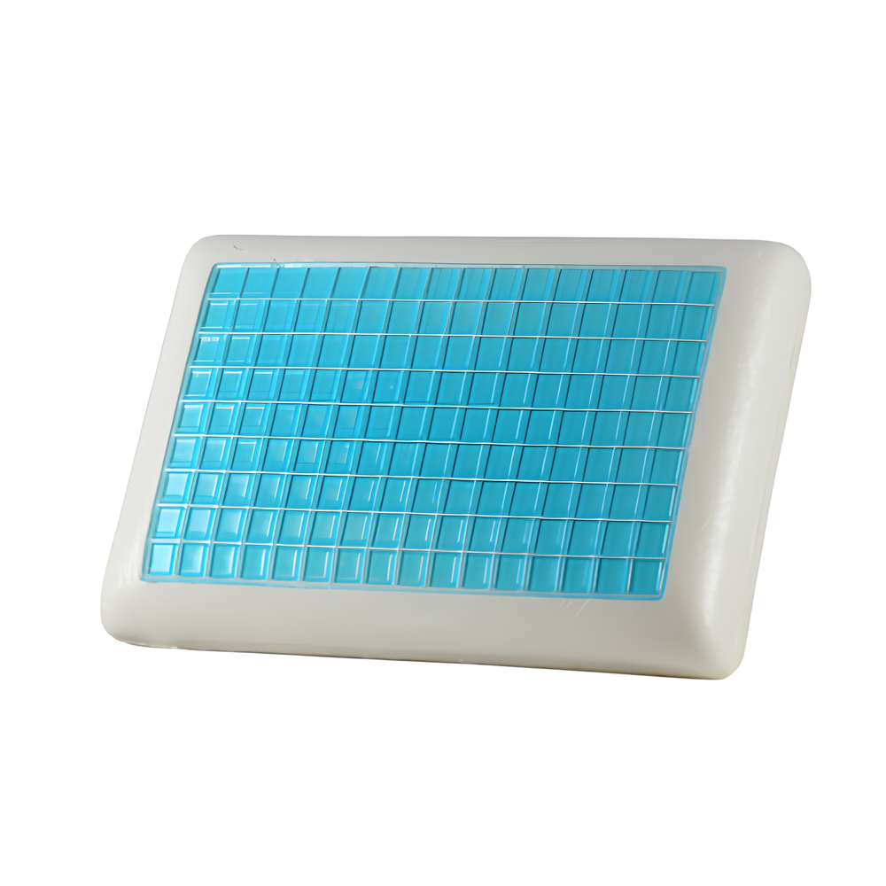 Travesseiro viscoelástico com gel frio, espuma 900g 40D , gel 380g , capa 100% poliester duplo jacquard com ziper, embalagem em pvc com ziper com encarte